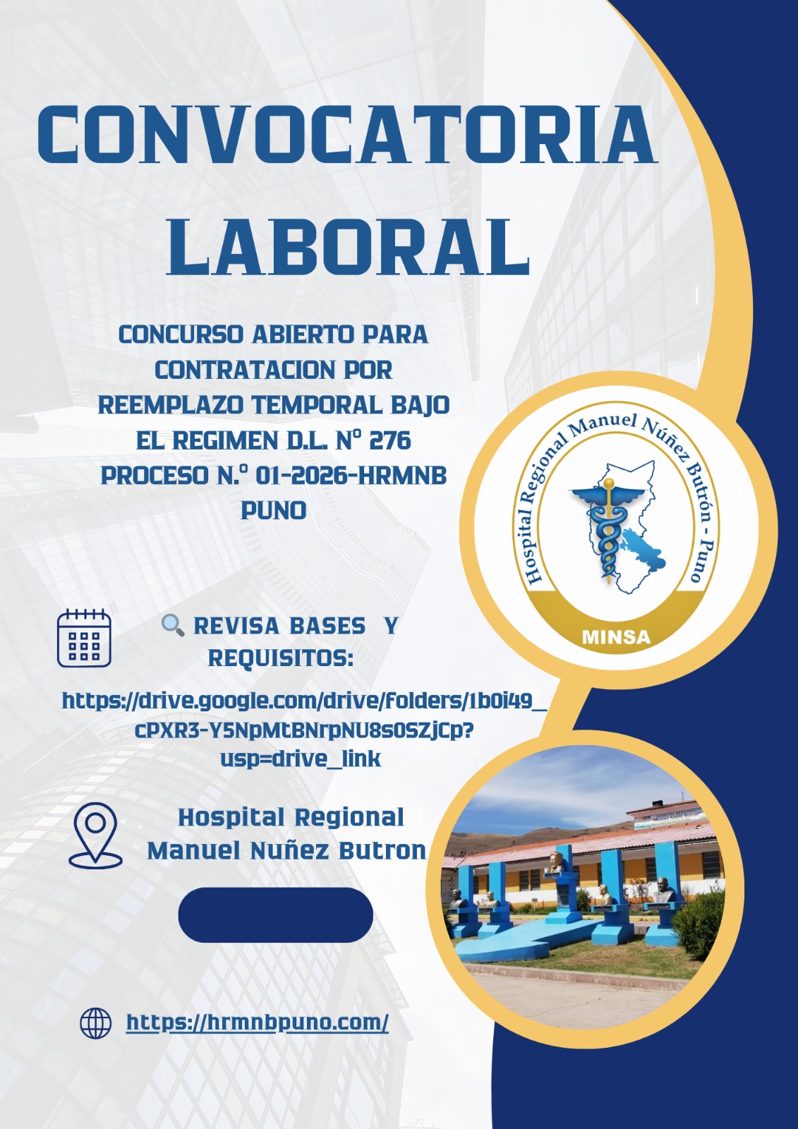 CONCURSO PUBLICO PARA CONTRATACION POR REEMPLAZO TEMPORAL BAJO EL REGIMEN D.L. Nº 276 – PROCESO N.º 01-2026-HRMNB PUNO. Deja un comentario / Comunicados, Comunicados Importante, Convocatorias / Por Webmaster HRMNB PUNO https://drive.google.com/drive/folders/1b0i49_cPXR3-Y5NpMtBNrpNU8s0SZjCp?usp=drive_link