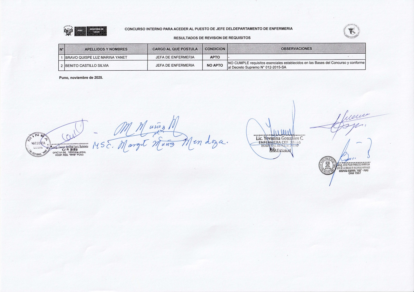 RESULTADOS PRELIMINARES CONCURSO ABIERTO JEFA DE ENFERMERAS Deja un comentario / Comunicados, Convocatorias / Por Webmaster HRMNB PUNO RESULTADOS PRELIMINARES CONCURSO ABIERTO JEFA DE ENFERMERAS_page-0001Descarga